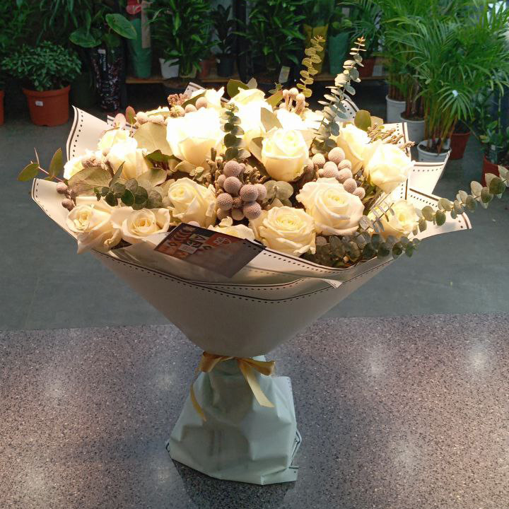 Огромный букет из 21 белой розы и брунии