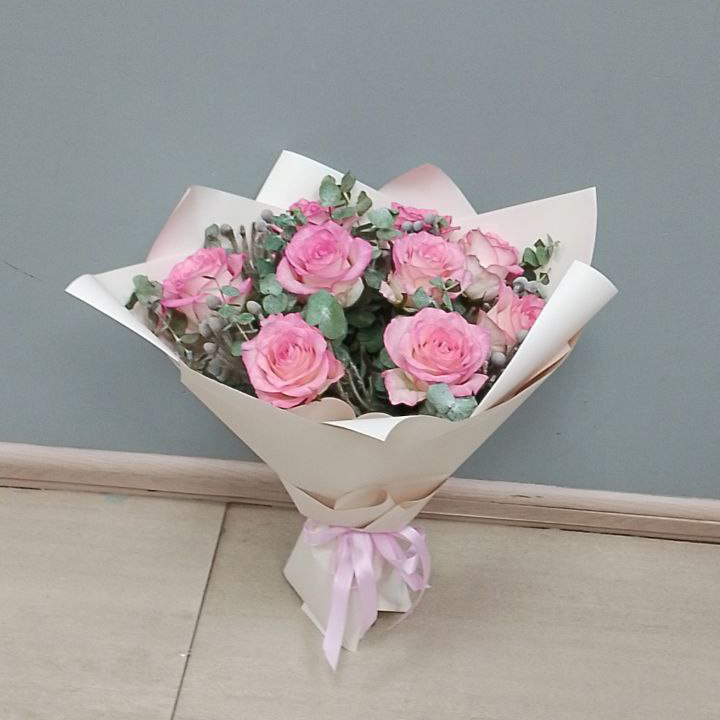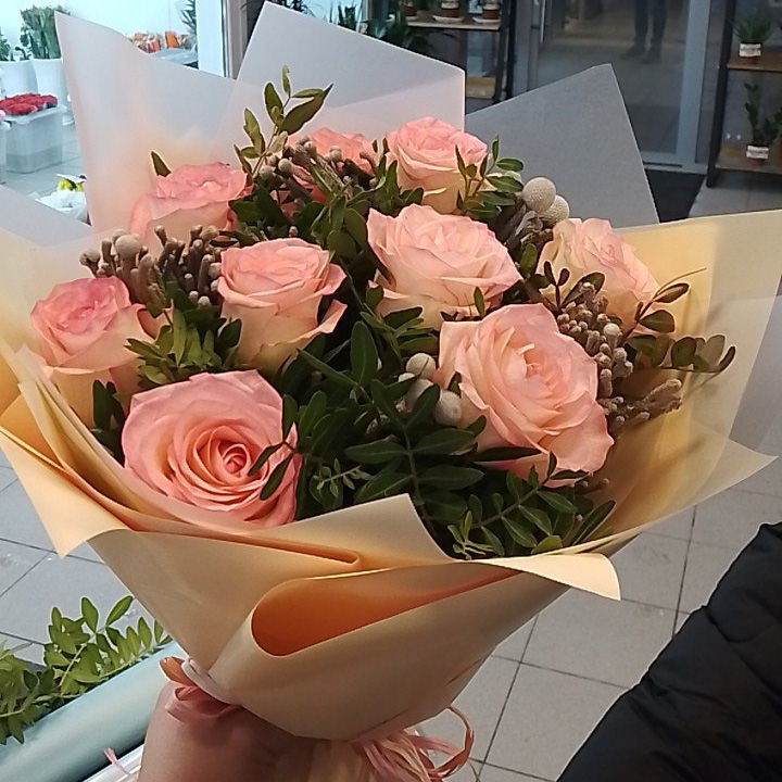 Букет из 9 розовых роз и брунии