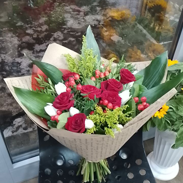 Букет из гиперикума, роз и аспидистра