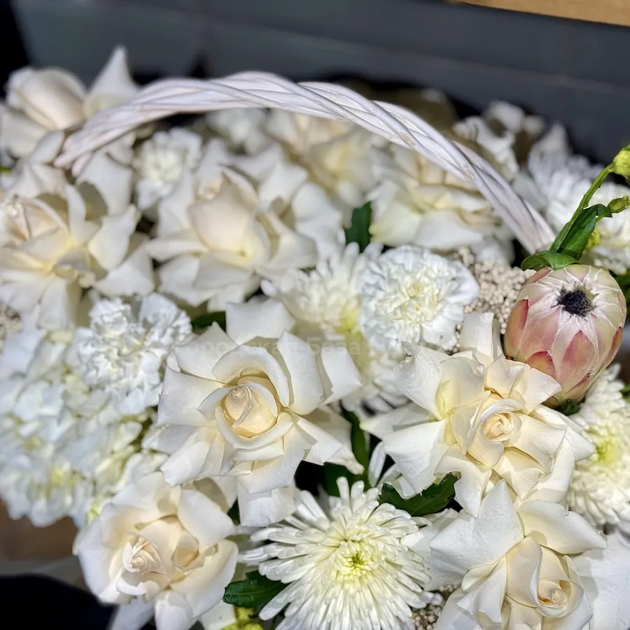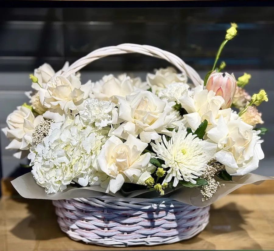 Букет из гвоздик, гортензий и роз эквадор в корзине