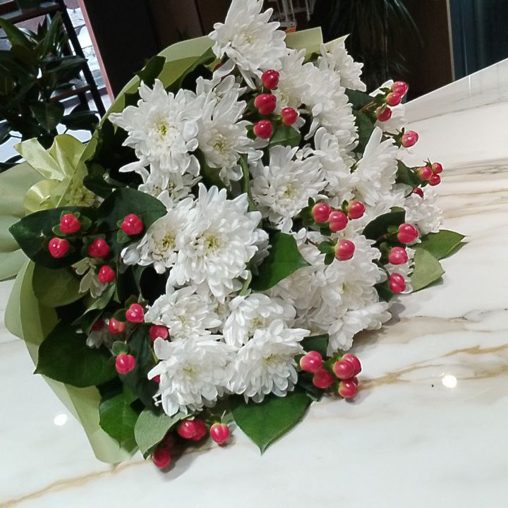 Большой букет из хризантем и гиперикума