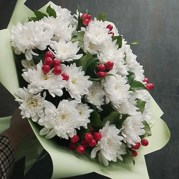 Букет из хризантем и гиперикума