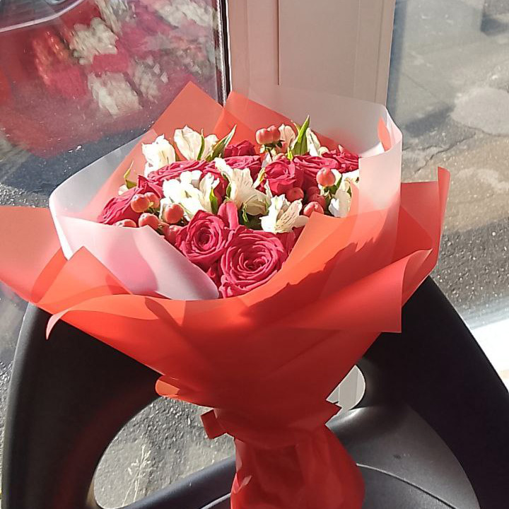 Букет из роз, альстромерий и гиперикума