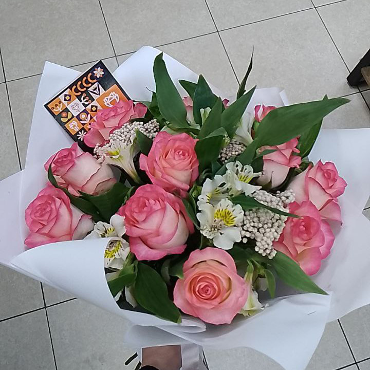 Букет из роз, альстромерий и грин трик
