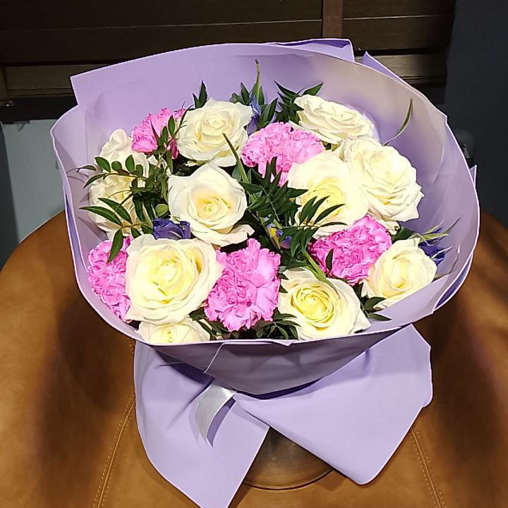 Букет из роз, фисташек и ирисов