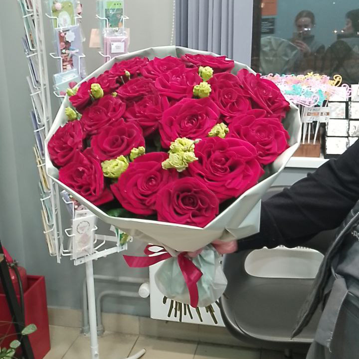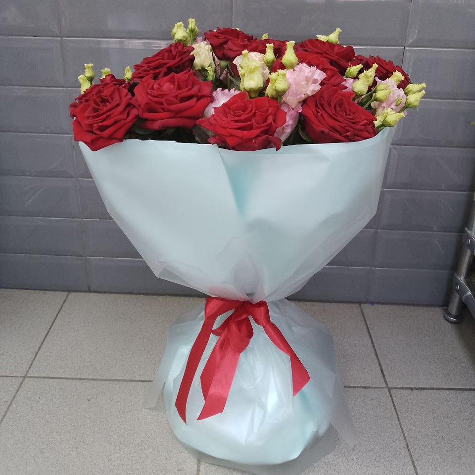 Этот букет, созданный из 17 роскошных роз длиной 70 см и 6 нежных веточек эустомы, станет превосходным подарком для девушки, подруги, сестры или жены. Оформление корейской пленкой (3 листа) и атласной лентой (1 шт.) придает композиции завершенный и стильный вид, подчеркивая ее утонченность и изящество.