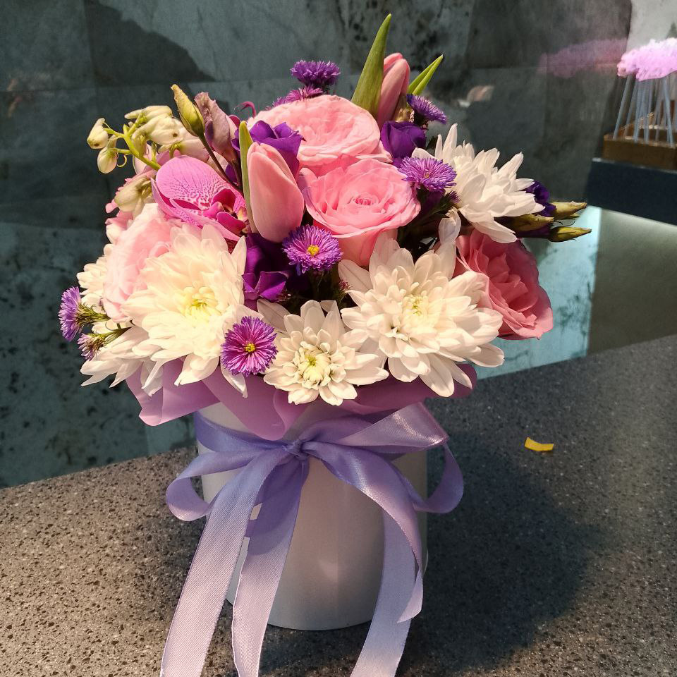 Розы, тюльпаны и хризантемы в коробке