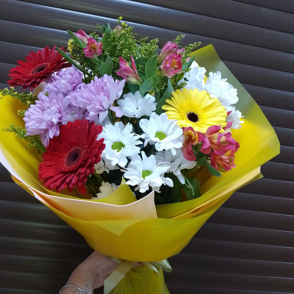 Букет хризантем, гербер и альстромерий