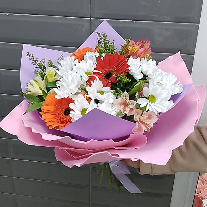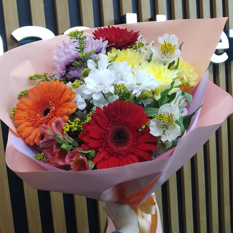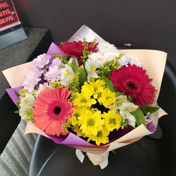 Букет хризантем, гербер и альстромерий